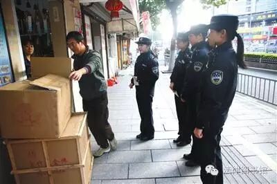 2015年12月3日,浙江宁波,江东区城管执法局女子执勤组首次亮相。百丈路上一位商户面对微笑执法的女队员,很配合地把摆在人行道上的货品收进店里。图/视觉中国
