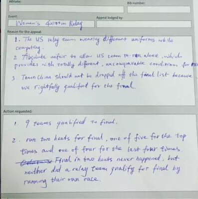 我们现在看看当时中国队抗议美国重赛的申诉理由: