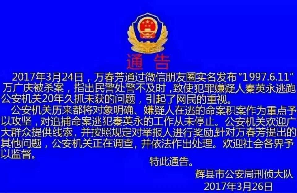 河南新乡辉县市公安局刑侦大队在两天后发布通告称,“对追捕命案逃犯秦英永的工作从未停止”,同时表示欢迎群众提供线索。