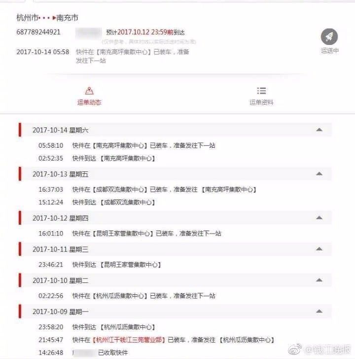 除了快递没及时送达,让王先生不解的还有,“从杭州发到四川的快递为什么中途去了昆明”。他猜测,快递会不会是在杭州瓜沥集散中心出了问题。记者随后从快递客服处了解到,由于昆明和南充的代码比较接近,有可能是人工分拣失误,导致本该发往四川的快递到了昆明。