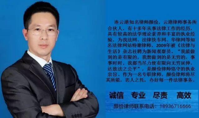 律师介绍: 江苏颜俭律师网由连云港资深律师颜俭律师创建,十余年办案经验,专业为您提婚姻家庭、民间借贷、建筑工程、房地产等法律服务。找连云港专业律师,请拨打18936716666 查看详细>>